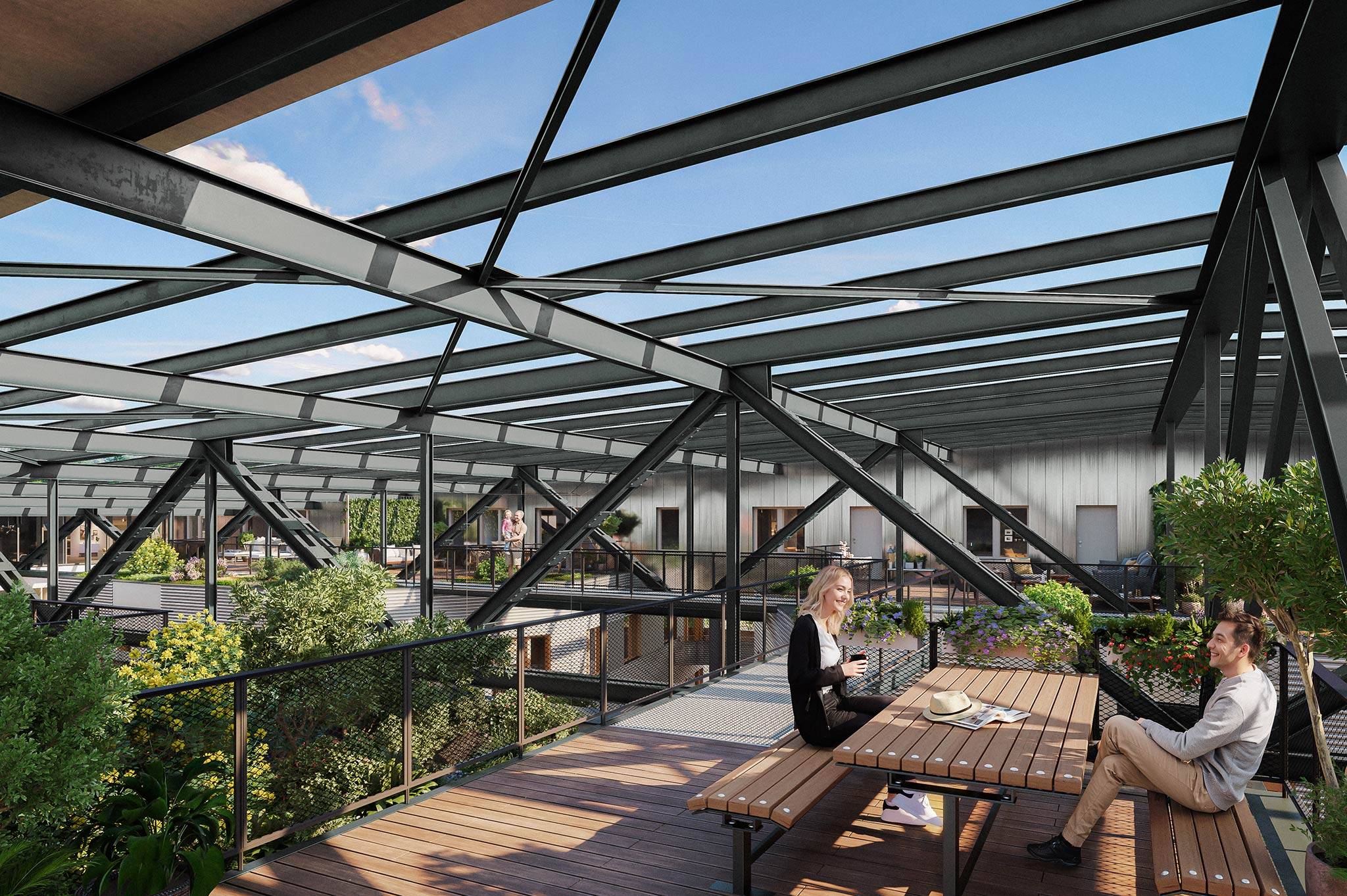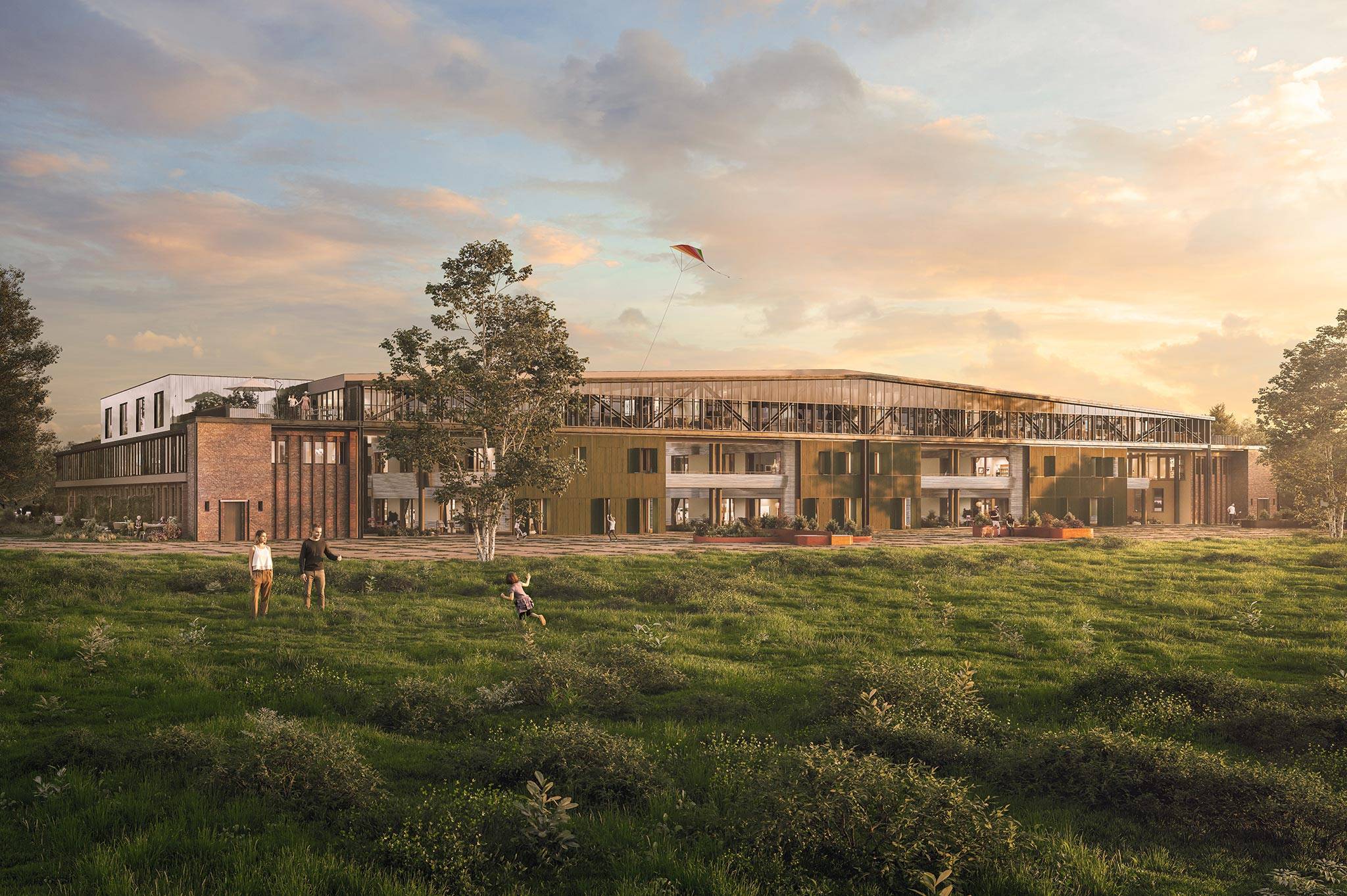 - Gemeinschaftsflächen: Hubschrauberpark mit Sitzbänken, langer Tafel und Outdoor-Fitness, Kinderspielplatz, Flugfeldpromenade